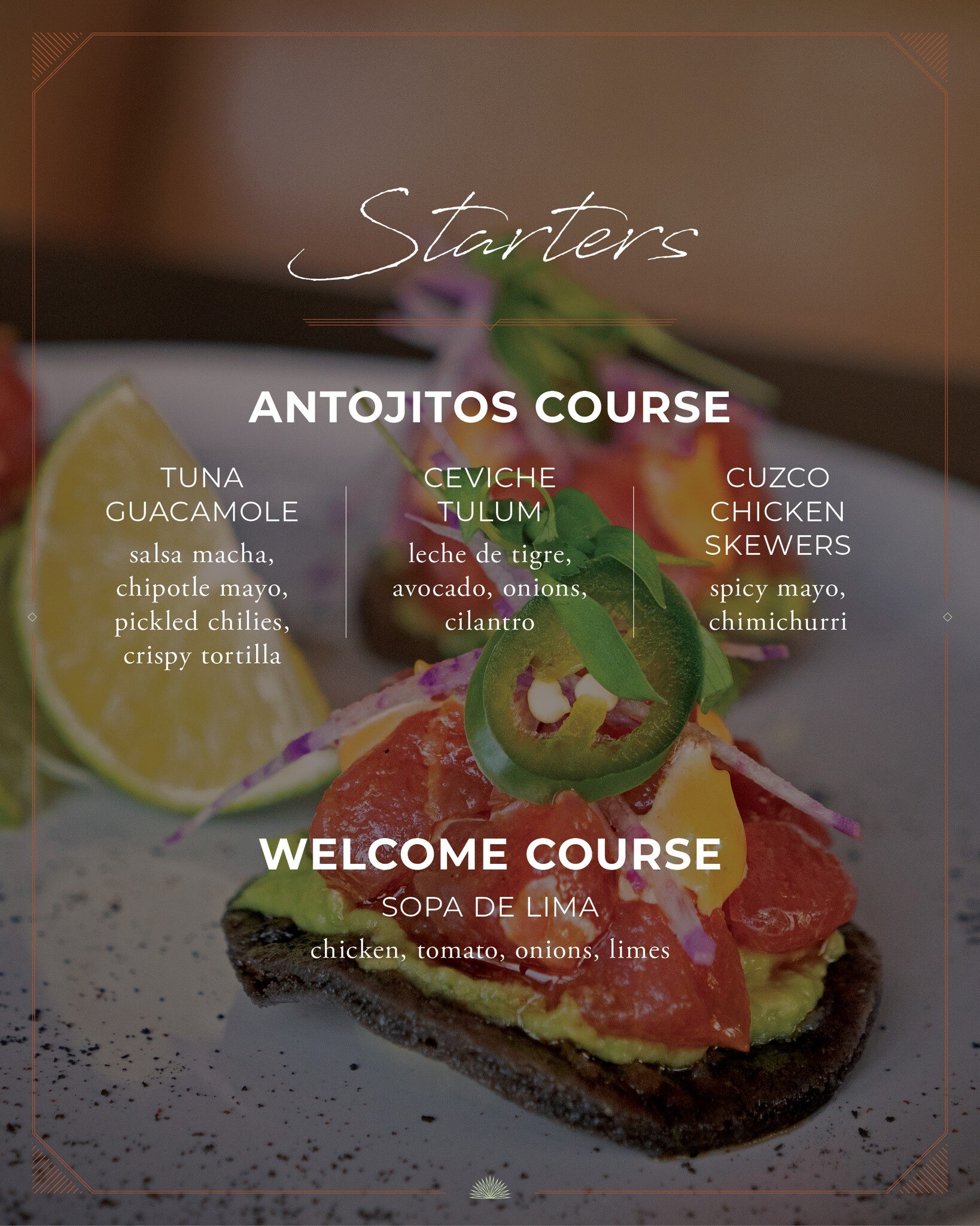 The menu is a delicious fusion of land and sea. Enjoy Sikil Pak (charred tomatoes, onions, toasted pepita seeds, and charred tostada), Poc Chuc Tacos (grilled ribeye, guacamole, xni-pek salsa, and blue corn tortillas), Octopus Maya (roasted potato foam, cherry tomatoes, chilemole, pickled onions, and chorizo oil), and Chocolate Fondant Cake (crema fresca ice cream, pink mole, agave almonds).